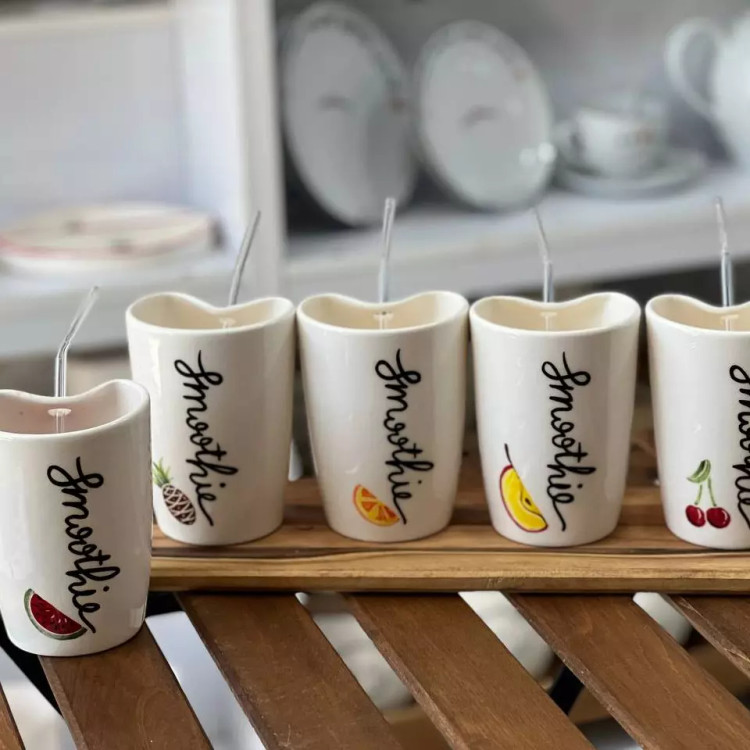 لیوان های اسموتی سرامیکی نی دار و روی لیوان طرح میوه بسیار شیک و کاربردی نیاز هر خانه