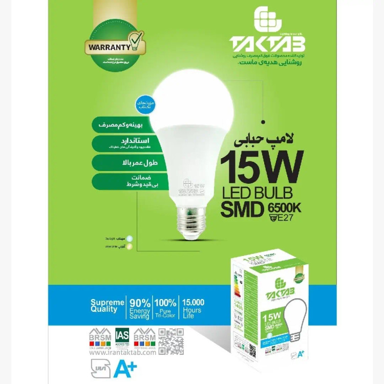لامپ حبابی ال ای دی15 وات تک تاب مهتابی پایه E27 استاندارد طول عمر بالا 90 در صد سیو انرژی