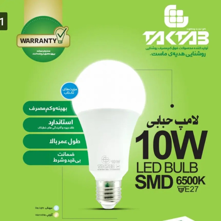 لامپ حبابی 10 وات اس ام دی شرکت تک تاب با طول عمر بالا 90 درصد سیو انرژی در دورنگ آفتابی و مهتابی