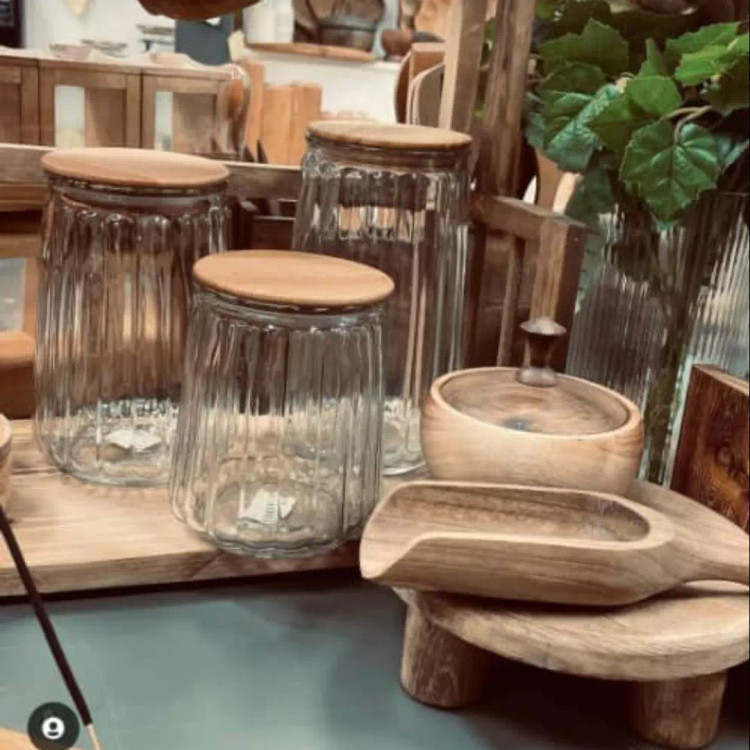 بانکه های سه تایی سه سایز مختلف راش نیلوفری کیفیت عالی و درب بامبو و شیشه شیار دار و جنس شیشه ضخیم