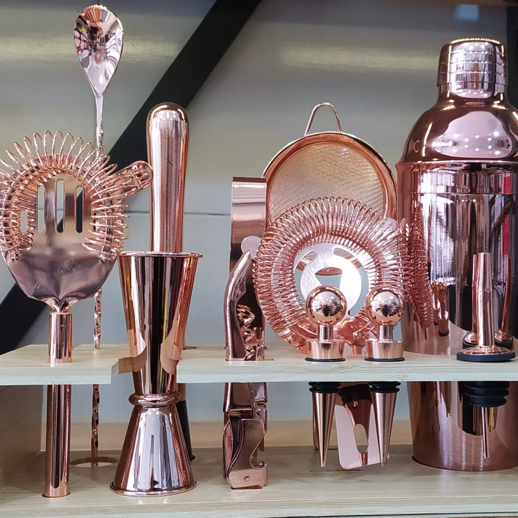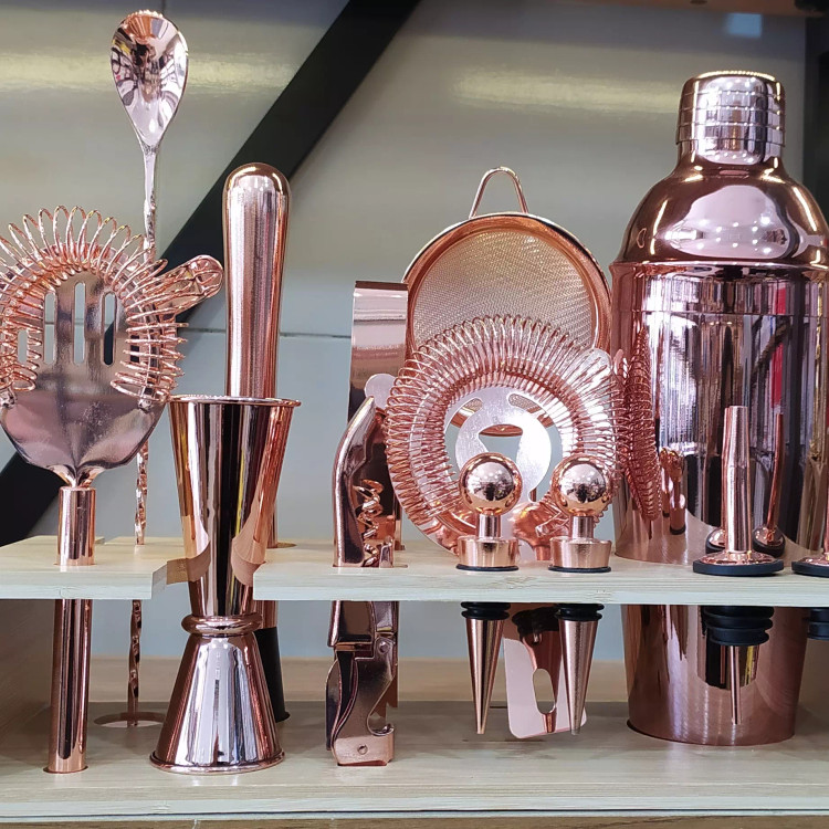 ست بار سرد با استند مخصوص کافه یا منزل برای درست کردن نوشیدنی های سرد رنگ گلبهی و طلایی موجوده